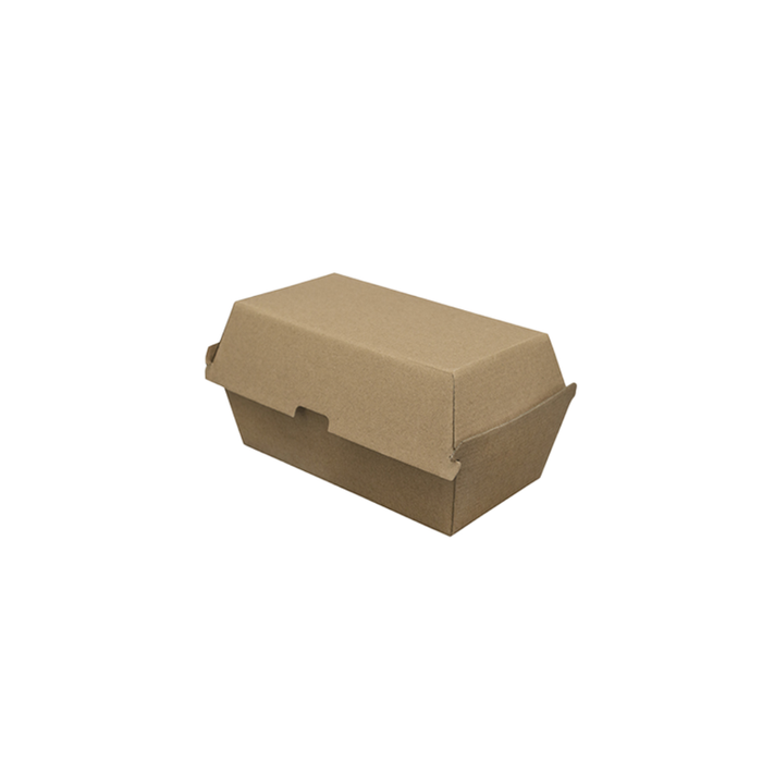 Our snack box is made with a sturdy, corrugated fluted board, so it's ideal for hot and greasy foods. It is compostable as it is made with unlined paperboard made without any plastic lining. The medium snack box is 175 x 90 x 84 and perfect for serving a burger with a side dish for takeaway, offered in natural brown kraft, with space for branding with stickers or stamps.