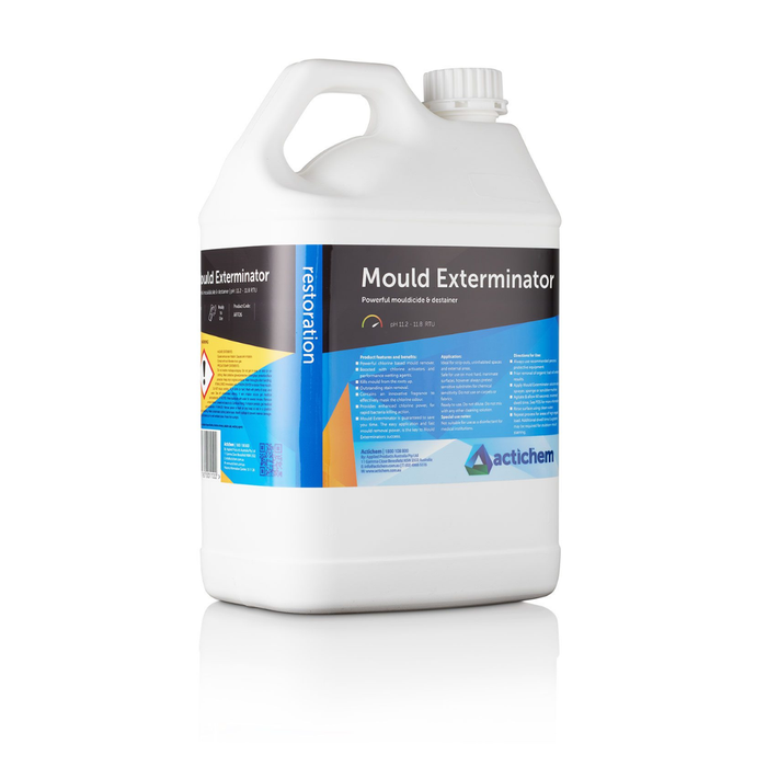 Mould Exterminator is a ready-to-use, advanced mould remediation solution formulated to rapidly kill and remove mould, fungi, and associated staining. Its powerful stain removal can be seen almost instantly when applied to mould-affected surfaces. Mould Exterminator's potentiated chlorine technology penetrates deep into the affected surface completely destroying the mould hyphae and root system, making it ideal for sub-floors, external walls, roofs, and uninhabited structures.