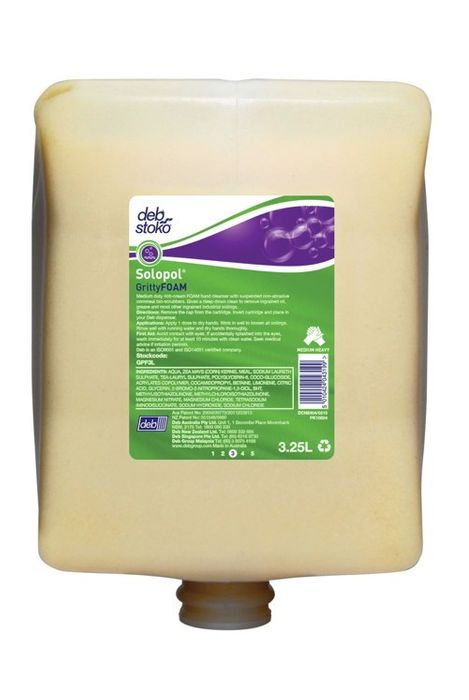 Deb's Solopol GFX Foam Cleaner is a unique, heavy duty foaming hand cleanser with suspended bio-scrubbers. foam spreads rapidly to emulsify contaminants and quickly rinses to reduce time and water required for a complete hand wash.
