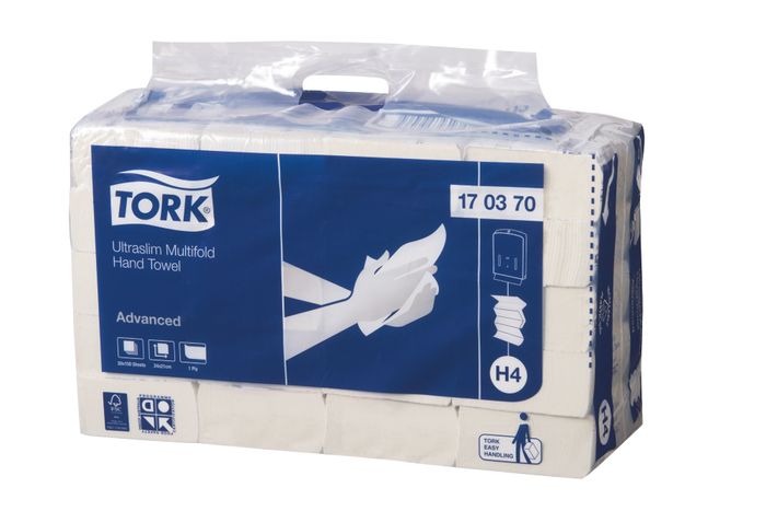 The Tork H4 Ultraslim hand towel system offers a high capacity dispenser that holds up to 375 towels reducing risk of run-out. With a slim contemporary design, it is lockable and also has a viewing window for easy servicing. Ultraslim Hand Towel is FSC Certified.