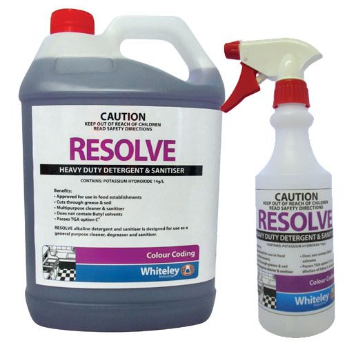 Resolve is an alkaline detergent designed for use as a general purpose cleaner, degreaser and sanitiser. Resolve is suitable for use in registered food preparation establishments.
