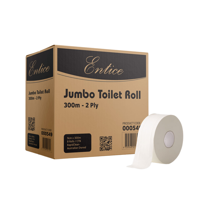 Quality 2ply Jumbo Entice toilet paper comes in cartons of 8 rolls with 300m per roll.